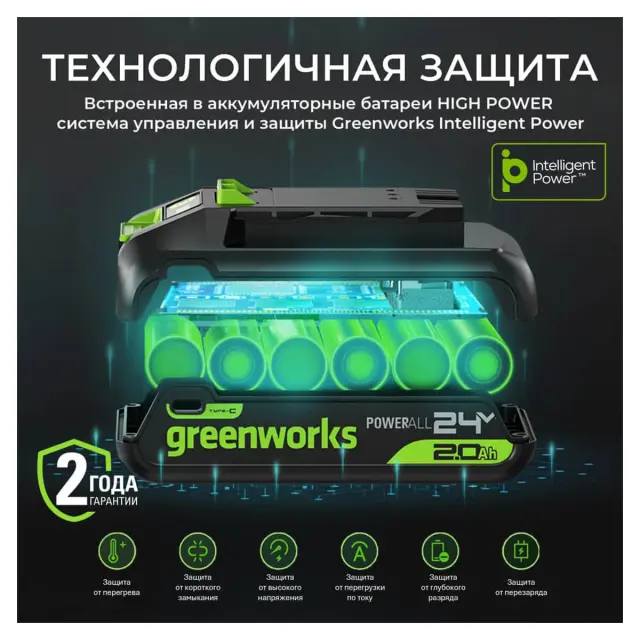 Помимо перечисленных выше преимуществ, аксессуар выделяется продуманной системой защиты от различных неисправностей. Многие аналогичные аккумуляторы предлагают лишь базовую защиту, в то время как Greenworks Intelligent Power обеспечивает всестороннее управление энергопотреблением и продлевает срок службы батареи. Это делает инвестицию в Greenworks более выгодной в долгосрочной перспективе.