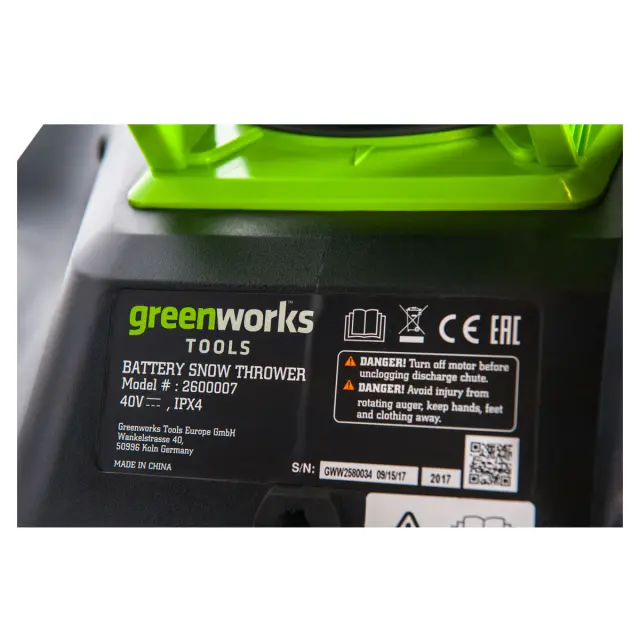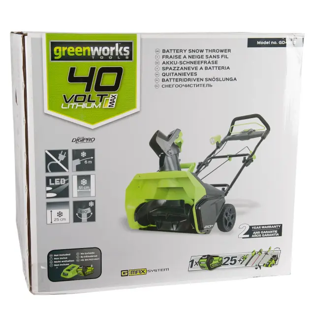 - 1 Аккумуляторный снегоуборщик Greenworks GD40ST 40V, арт. 2600007