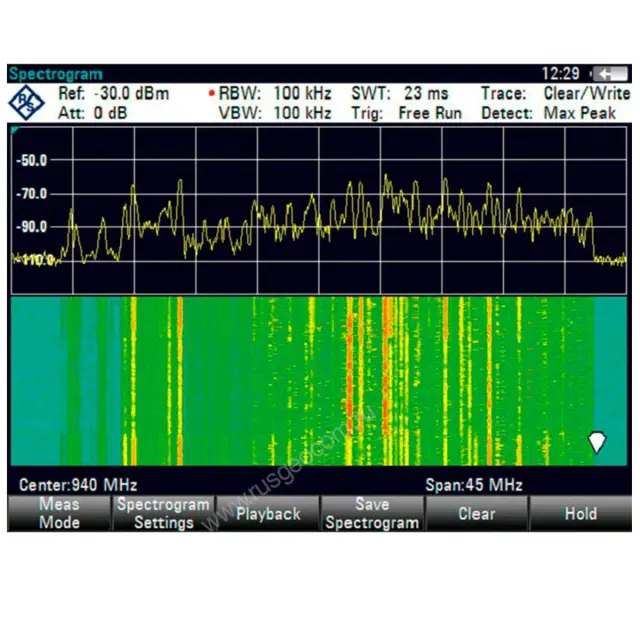 Опции R&S®FSH-K14 и R&S®FSH-K15 для измерения спектрограмм позволяют анализатору R&S®FSH сохранять зависимость спектра от времени. В результате появляется возможность анализа прерывистых сбоев или изменений частоты и уровня в зависимости от времени. Необходимые оценки могут быть сделаны путем воспроизведения записанных данных и установки линий времени и маркеров.