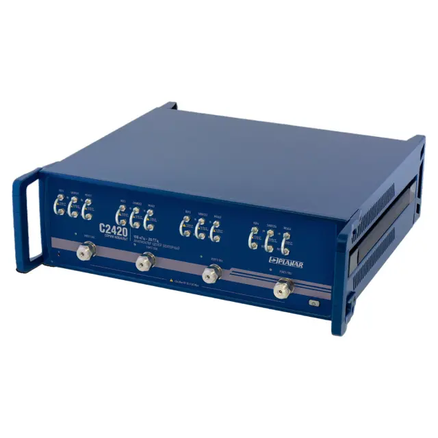 Анализатор цепей векторный Planar C2420 – высокопроизводительный лабораторный прибор из серии Кобальт, который характеризуется лучшей в отрасли скоростью развертки при широком динамическом диапазоне. Устройство оборудовано четырьмя портами, обеспечивающими измерения S-параметров в полосе частот от 0,1 МГц до 20,0 ГГц, и управляется по USB каналу с помощью пользовательского ПК и программного обеспечения S4VNA. Для расширения круга измерительных задач, реализован прямой доступ к генераторам и приемникам прибора во всех каналах, выводы которых размещены на передней панели и при работе в обычном режиме закорочены конфигурационными перемычками с низким энергопотреблением.
