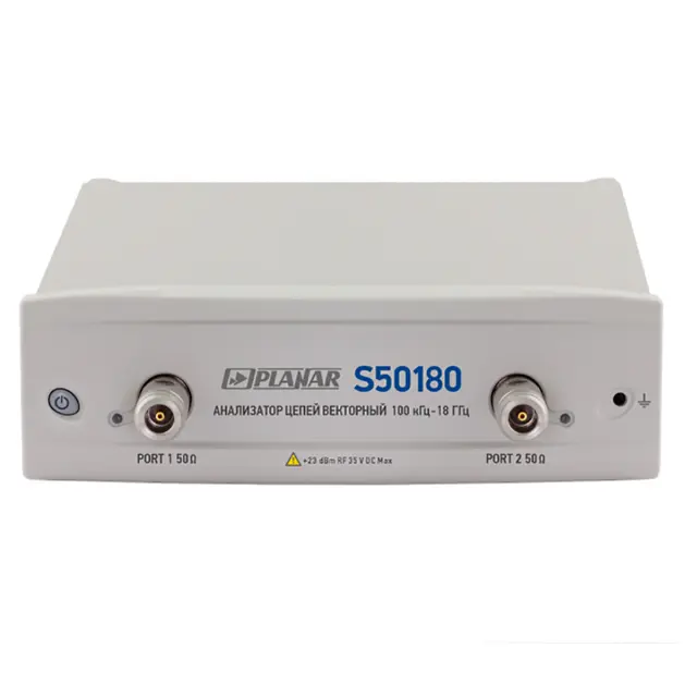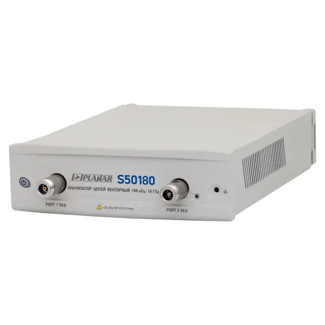 Анализатор цепей векторный Planar S50180 ориентирован на использование в ходе разработки, производства, тестирования и настройки радиотехнических устройств и СВЧ оборудования. Прибор обеспечивает измерение КСВН, модуля и фазы коэффициента отражения и коэффициента передачи, а также других параметров в диапазоне частот от 0,1 до 18 000 МГц в многополюсных системах с волновым сопротивлением 50 Ом.