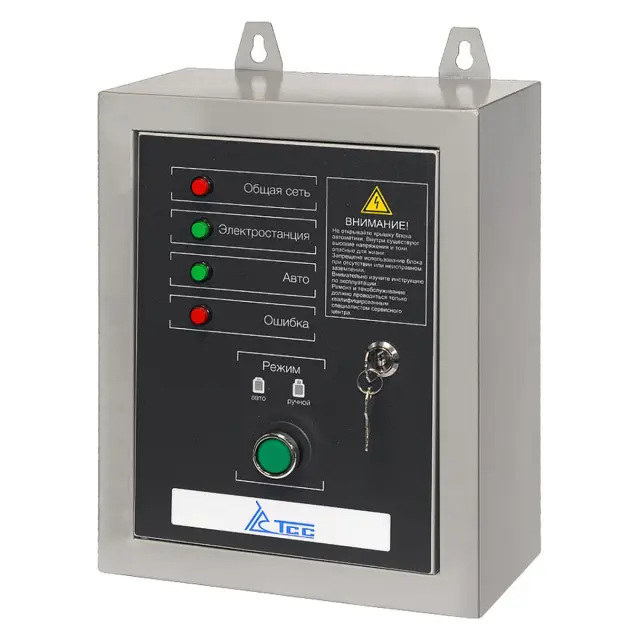 Оборудованный всего одной кнопкой управления, с помощью которой выбирается автоматический либо ручной режим работы, блок АВР-С TSS 9500D/230/400 характеризуется простотой использования. Аппарат не нуждается в каких-либо дополнительных действиях со стороны пользователя после первичной настройки. На лицевой панели устройства размещены световые индикаторы, позволяющие контролировать наличие напряжения во внешней линии, активацию автоматического режима работы, включение автономного источника питания или выявление ошибки в системе. Использование двух цветов: зеленого и красного – повышает наглядность индикации. Для исключения вмешательства посторонних лиц в работу системы и обеспечения возможности быстрого доступа к коммутационным элементам и компонентам внутренней автоматики для обслуживания и ремонта, передняя панель, которая также является дверцей блока АВР, закрывается на ключ.