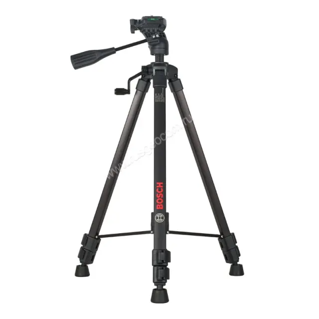 Bosch BT 150 оборудован 2 пузырьковыми уровнями, один из которых расположен на подъемной площадке для контроля угла наклона, а второй, необходимый для выставления оптимального положения треноги на плоскости, в месте крепления стоек. Предусмотрен отдельный фиксатор для закрепления положения ножек и система, страхующая от их внезапного расхождения в стороны. Наконечники стоек снабжены резиновыми колпачками, которые препятствуют скольжению и повреждению напольных покрытий.