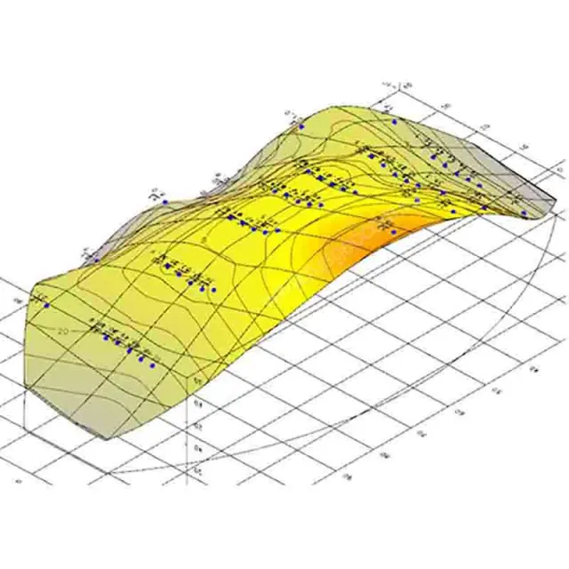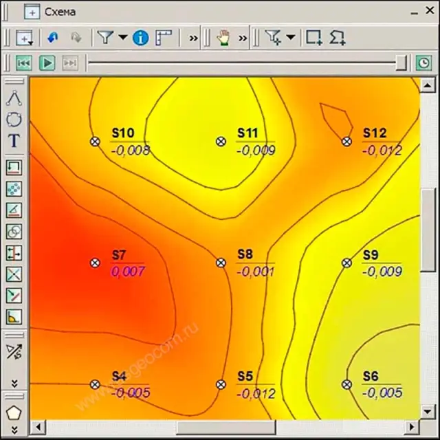 - Построение и отображение при помощи изолиний и градиентной заливки следующих видов деформационной поверхности: абсолютное смещение марок по высоте, скорости смещения марок по высоте, максимальной кривизны деформационной поверхности.