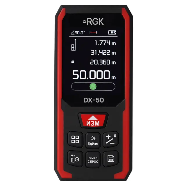 Оснащенный 2-дюймовым цветным IPS-дисплеем, лазерный дальномер RGK DX-50 позволяет комфортно снимать показания в любом положении – благодаря функции автоповорота экрана, которую, при необходимости, можно заблокировать. Для снижения энергопотребления и улучшения считываемости данных используется инверсное отображение – на темном фоне высвечиваются символы в светлых оттенках.