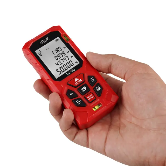 Лазерный дальномер RGK DZ50 представляет собой компактный прибор для определения расстояний и размеров с рабочим диапазоном до 50 м, обладающий расширенными измерительными и вычислительными функциями. Особенностью лазерных рулеток серии DZ является наличие двух встроенных взаимно перпендикулярных цилиндрических пузырьковых уровней, продольного и поперечного, которые размещены на лицевой панели корпуса. Прибор подходит для замеров в горизонтальной и вертикальной плоскости, при этом обладает более демократичной ценой, по сравнению с лазерными измерителями расстояний, оснащенных внутренним инклинометром.