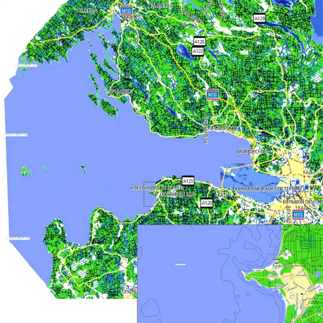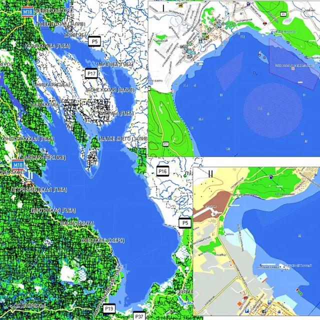 карта совмещающая карты дорог, глубин водоемов и топографические карты.