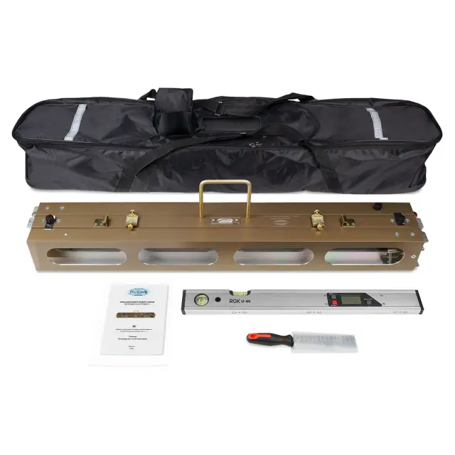 Рейка РДУ "Кондор" от компании производителя Русгеоком — трёхсекционный инструмент для оценки неровности дорожного полотна, измерения крутизны откосов, насыпей и выполнения аналогичных задач в дорожном строительстве. Оборудована клиновым промерником для замеров просветов. Внесена в Госреестр, что позволяет применять её в госпроверках и оформлении официальной документации.