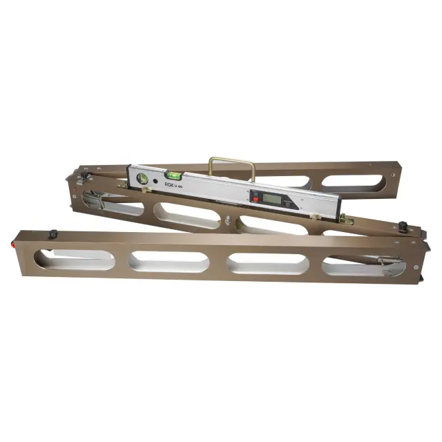 Рейка РДУ "Кондор" от компании производителя Русгеоком — трёхсекционный инструмент для оценки неровности дорожного полотна, измерения крутизны откосов, насыпей и выполнения аналогичных задач в дорожном строительстве. Оборудована клиновым промерником для замеров просветов. Внесена в Госреестр, что позволяет применять её в госпроверках и оформлении официальной документации.