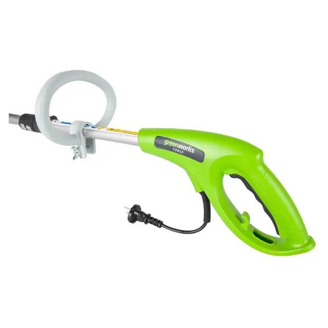 Положение дополнительной передней ручки можно изменять, подгоняя электрический триммер Greenworks GST5033 "под себя". Для повышения комфортности и безопасности работ предусмотрена возможность фиксации шнура удлинителя на рукоятке инструмента, для чего в нижней части скобы выполнена прорезь и размещен крючок с внутренней стороны. Такая конструкция поддерживает штепсельное соединение без натяжения кабеля, за счет чего исключается непреднамеренное выдергивание вилки из розетки.