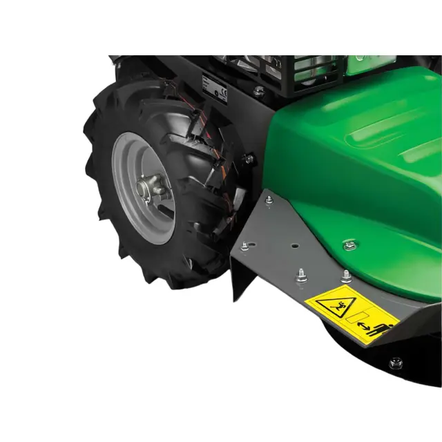 Два больших пневмоколеса с сельскохозяйственным протектором помогают технике преодолевать любые препятствия и неровности на территории, что особенно полезно при работе на сложном рельефе или в условиях сильной густоты растительности.