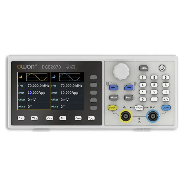 Генератор сигналов OWON DGE2070 представляет собой настольное лабораторное устройство в компактном исполнении, построенное на основе 14-битного ЦАП и оснащенное двумя каналами с идентичными характеристиками. Изделие отличается от младшей модели серии DGE расширенным частотным диапазоном до 70 МГц и повышенной до 300 Мвыб./с частотой дискретизации. Прибор поддерживает дистанционное управление по USB каналу и обеспечивает формирование предустановленных 5 стандартных и более 150 произвольных сигналов, в том числе с наложением разных видов модуляции и свипирования внутренними средствами. Также аппарат способен воспроизводить 16 пользовательских форм, которые можно сохранять в энергонезависимой памяти при его автономном использовании, и поддерживает пакетный режим.