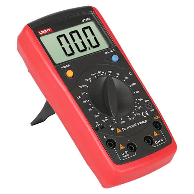 Измеритель RLC UNI-T UT601 представляет собой цифровой прибор, предназначенный для определения основных параметров электронных компонентов и радиодеталей – емкости и сопротивления, а также может использоваться для проверки характеристик транзисторов, контроля исправности диодов и целостности электрических цепей. С его помощью можно отслеживать фактические характеристики радиоэлектронной продукции, реализуя контроль качества на производственных предприятиях, определять номиналы неизвестных элементов в ходе ремонта оборудования, а также осуществлять подбор компонентов с требуемыми параметрами при конструировании электронных и цифровых устройств. Радиоизмерительный прибор выполнен в форм-факторе компактного мультиметра в двухслойном корпусе, с автономным питанием от сменной 9-вольтовой батареи, и подходит как для стационарного, так и мобильного применения.
