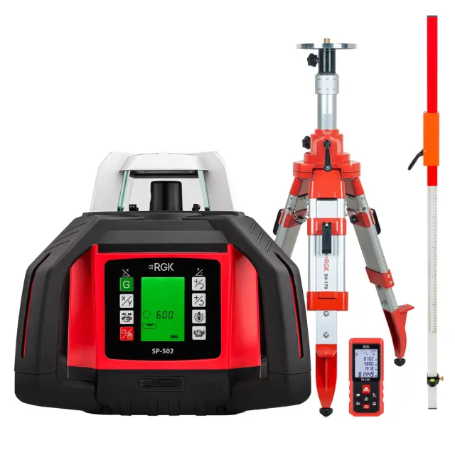 Отзывы о Комплект: ротационный нивелир RGK SP-502 + элевационный штатив RGK SH-170 + рейка RGK LR-2 + дальномер RGK DL100