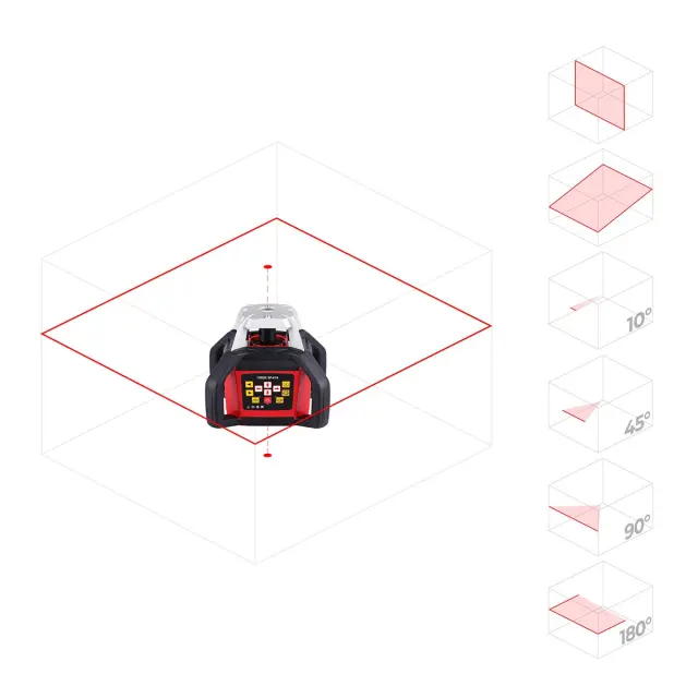Нивелир имеет впечатляющие технические характеристики, поэтому вы можете использовать его для решения самых ответственных задач в помещении или на строительной площадке без лишних затрат времени и рабочей силы. Лазерная призма вращается со скоростью до 600 оборотов в минуту, обеспечивая построение в пространстве плоскости с точностью 10 мм на 100 метров. Вы можете вручную выбирать скорость вращения в режимах 0, 300 или 600 оборотов в минуту, пользоваться режимами сканирования по сектору или проецирования точки.