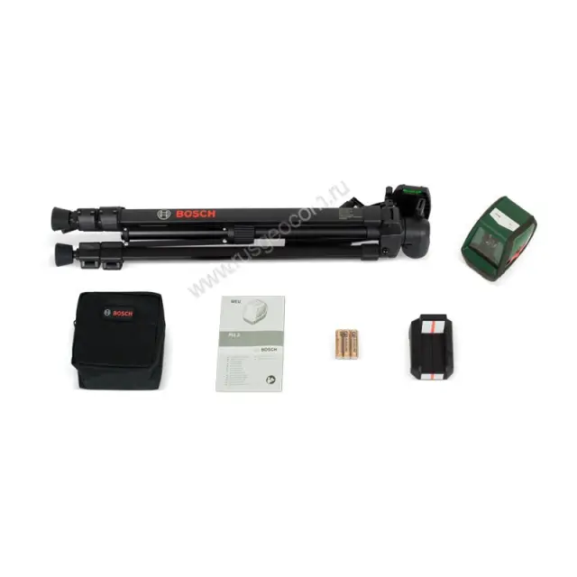 Дисплей, предназначенный для индикации угла наклона, оснащён подсветкой. Такой экран позволит работать в условиях недостатка освещения. Лазерный нивелир работает от четырех стандартных батареек типа АА. Универсальное крепление позволяет надежно зафиксировать прибор на распорной штанге или штативе. Корпус прибора выполнен из прочного пластика и оснащён мягкими накладками: они обеспечивают более комфортное удержание прибора в руке и защищают его от случайных ударов. Купить лазерный нивелир Bosch PLL 2 вы можете также в комплекте с прочным, надежным и удобным держателем (комплектация Bosch PLL 2 Set).