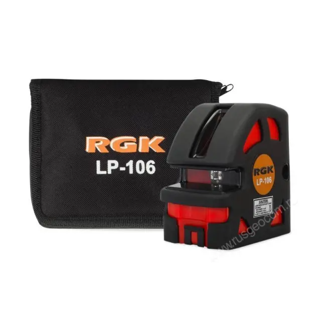 Лазерный нивелир RGK LP-106 очень прост и доступен в эксплуатации, работа с ним не требует специальной подготовки. Для выполнения разметочных работ на строительной площадке нивелир RGK LP-106 дополнительно может комплектоваться электронным детектором LD-8, который способен улавливать лазерный луч при любом освещении. Сразу же при включении прибор готов к работе: лазерный нивелир RGK LP-106 оснащен системой компенсации наклона прибора, основанной на простом и надёжном механизме магнитного маятника. Блокиратор компенсатора защищает механизм во время транспортировки, а так же позволяет строить наклонные плоскости. Устройство компенсирует отклонение от горизонтали в диапазоне 4°. Резьба крепления у LP-106 имеет диаметр ¼", для надежного крепления прибор на фотоштатив. Корпус прорезинен и разработан по современным стандартам, что позволяет защитить прибор от пыли, влаги, перепадов температуры. Прибор работает от трех батареек (аккумуляторов) типа АА, рабочее время при этом составляет более 10 часов.