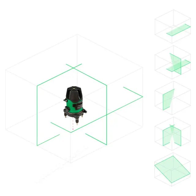 Отличный осепостроитель для дома. Погрешность на 2,5 метра вертикаль и горизонталь не увидел. Сравнивал с советским литым алюминиевым уровнем, проверенным. Мне лучше и не надо, комнаты от центра как раз такие, а хоз ещё меньше. В заблокированном состоянии для диагоналей нажать и подержать кнопку сверху. При выходе за границу самонивелирования мигают линии и пищит. Комплект брал самый простой.