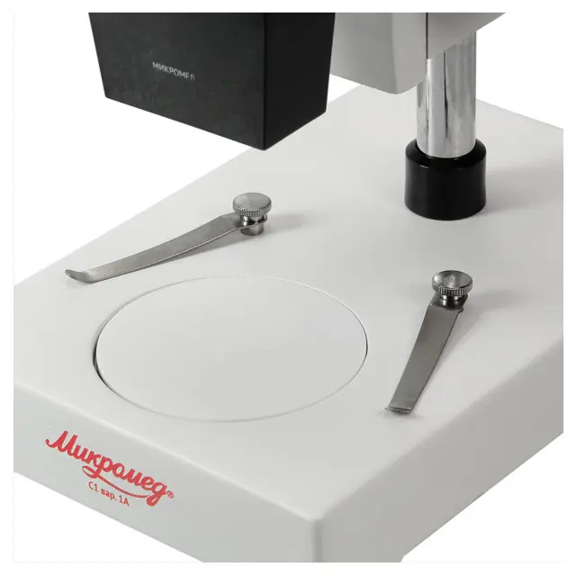 - 1 Штатив (с объективами, бинокулярной насадкой, основанием с колонкой и предметным столиком диаметром 60 ммс зажимами)