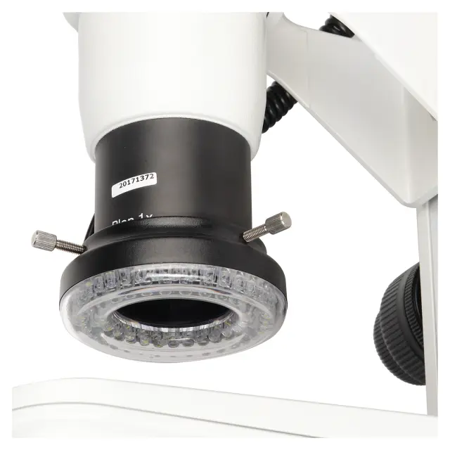 Микроскоп Микромед MC-А-0880 предназначен для исследования любых предметов, как прозрачных, так и непрозрачных. Для этого в его конструкции предусмотрено два осветителя. Кольцевой LED источник отраженного имеет 50 светодиодов, расположенных вокруг объектива. Такой осветитель создает бестеневое освещение, что позволяет наблюдать изображение без искажений формы деталей предмета, вызываемого резкими тенями.