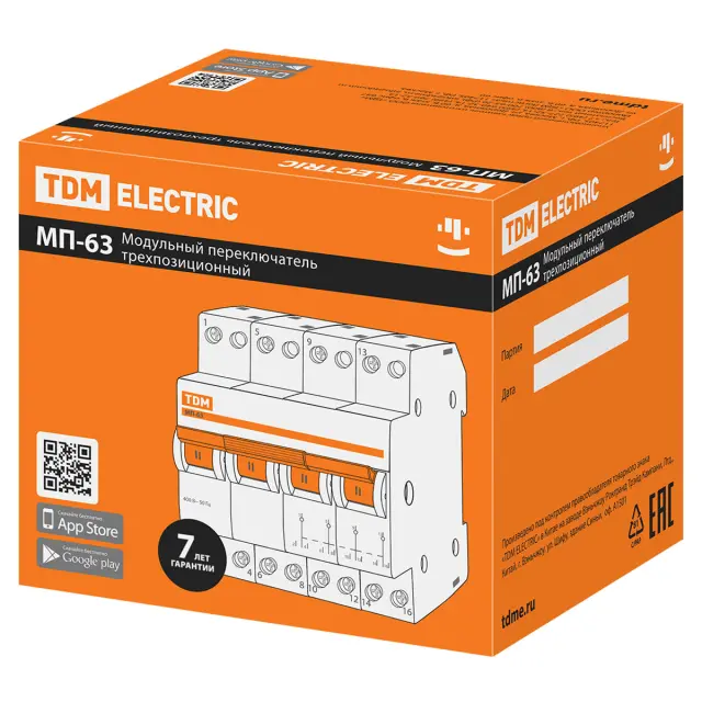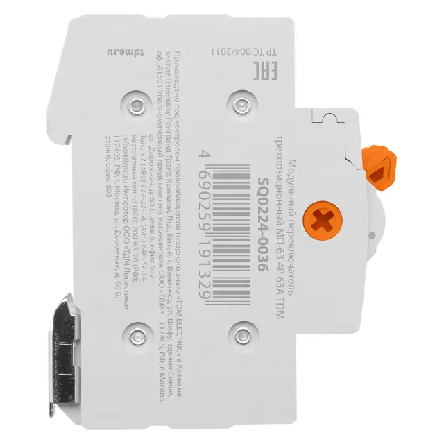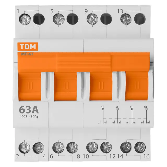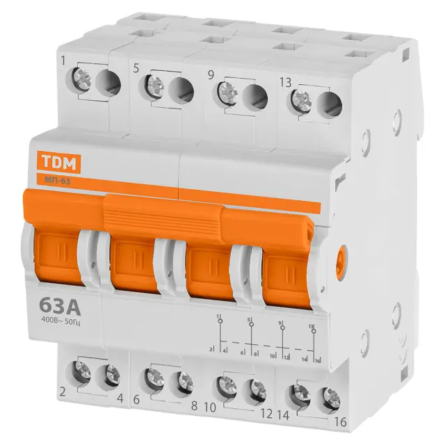 Технические характеристики Модульный переключатель трехпозиционный TDM МП-63 4P 63А для трехфазной сети