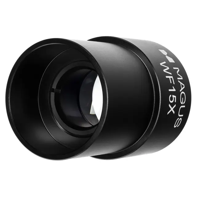 Окуляр с 15-кратным увеличением и с полем зрения 15 мм. Подходит для работы на микроскопах MAGUS разных серий. Не оснащен кольцом диоптрийной коррекции. Подстройка резкости под зрение наблюдателя осуществляется с помощью кольца на окулярном тубусе микроскопа. Подходящий диаметр тубуса – 30 мм.