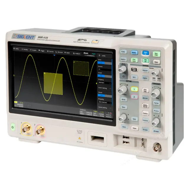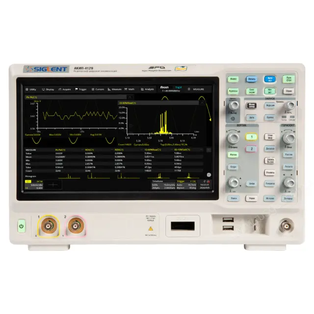 Осциллограф АКИП-4129 оборудован двумя каналами, которые обеспечивают пропускную способность в диапазоне от 100 до 350 МГц в зависимости от выбранной опции. Это позволяет анализировать широкий спектр электрических сигналов с высокой степенью точности. Частота дискретизации достигает 1 ГГц на один канал, что гарантирует качество получаемого сигнала и минимизирует вероятность искажений.
