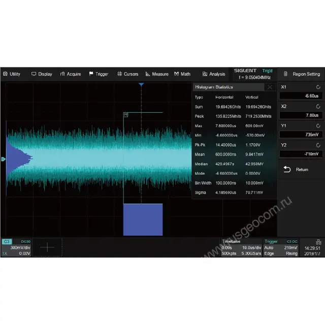 Осциллограф АКИП-4134/1А поддерживает два типа интерполяции: Sin X/X и линейную. Это обеспечивает высокую точность измерений и возможность работы с самыми сложными сигналами. Благодаря встроенным математическим функциям и быстрому преобразованию Фурье (FFT) вы сможете выполнять сложные вычисления, анализировать сигналы и извлекать из них полезную информацию. Возможность складывать, вычитать, умножать и делить сигналы открывает новые горизонты для анализа и диагностики.