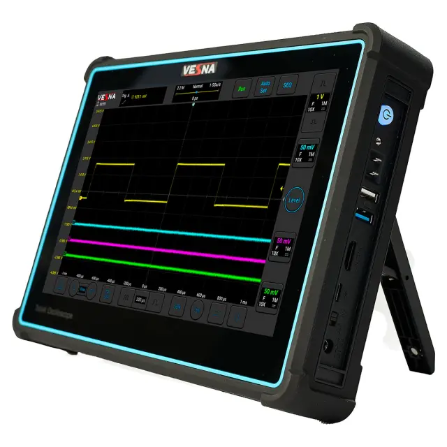 Осциллограф VESNA OVU2-403 — это портативный профессиональный прибор, сочетающий производительность стационарного оборудования и удобство полевой диагностики. С полосой пропускания 300 МГц, частотой дискретизации до 2 Гвыб./с и скоростью обновления 300 000 осциллограмм в секунду, он обеспечивает надежный захват даже самых редких и кратковременных событий. Благодаря 10,1-дюймовому дисплею с высокой четкостью, все детали сигнала — от фронтов до джиттера — становятся видимыми без подключения к внешнему монитору.