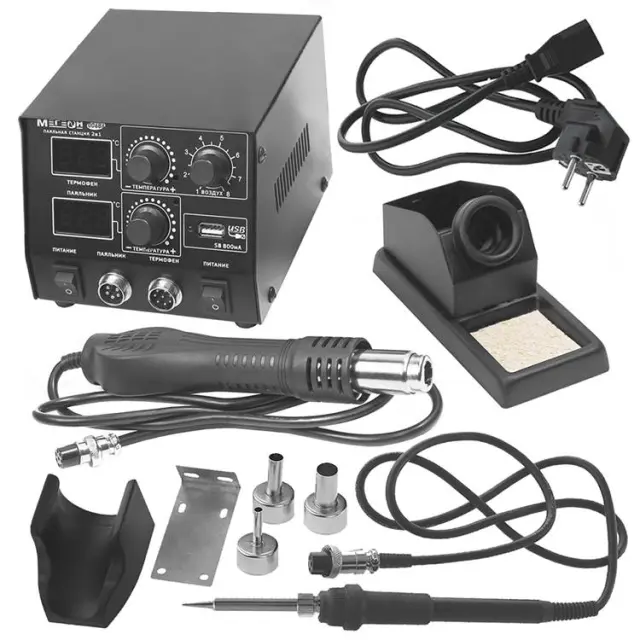 | Размеры станция / фен / паяльник | 200 х 130 х 120 мм / Ø57 х 280 мм / Ø25 х 210 мм |