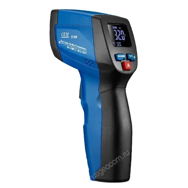 Пирометр CEM DT-820 оснащен лазерным указателем и дистанционно измеряет температуру в диапазоне -40°С … +380°С с оптическим разрешением 12:1. С помощью прибора можно выполнять измерение температуры раскаленных или движущихся объектов, находясь на безопасном расстоянии.