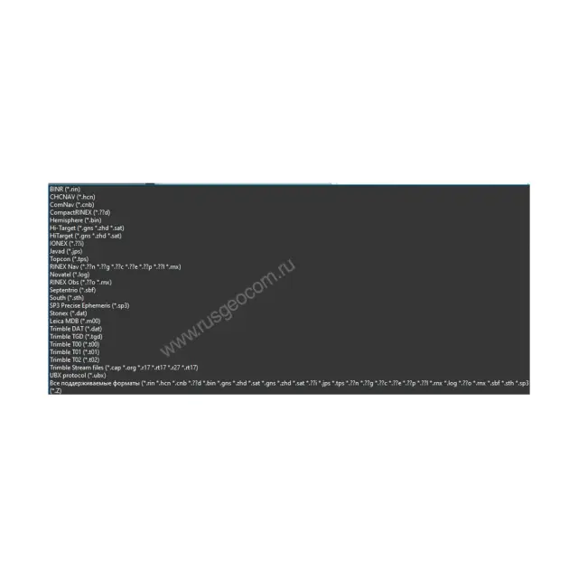 - Trimble — *.dat, *.tgd, *.t00, *.t01, *.t02, потоковые форматы *.cap, *.org, *.r17, *rt17, *.r27, *.rt27,