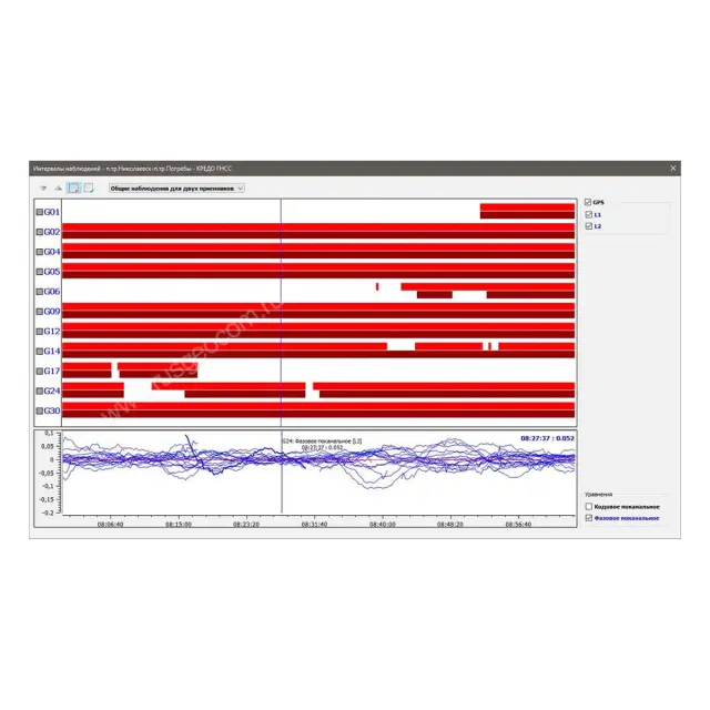 ТИМ КРЕДО ГНСС предоставляет удобные инструменты для просмотра, анализа и редактирования данных спутниковых измерений. Данные по сессиям наблюдений и эфемеридам проекта можно просматривать в виде временных диаграмм. Наблюдения сессии, используемые модели физических явлений, оценку качества наблюдений в виде разности вычисленного расстояния до спутника и соответствующего наблюдения, DOP можно просматривать в удобном виде диаграмм видимости спутников и графиков рассматриваемой величины от времени.
