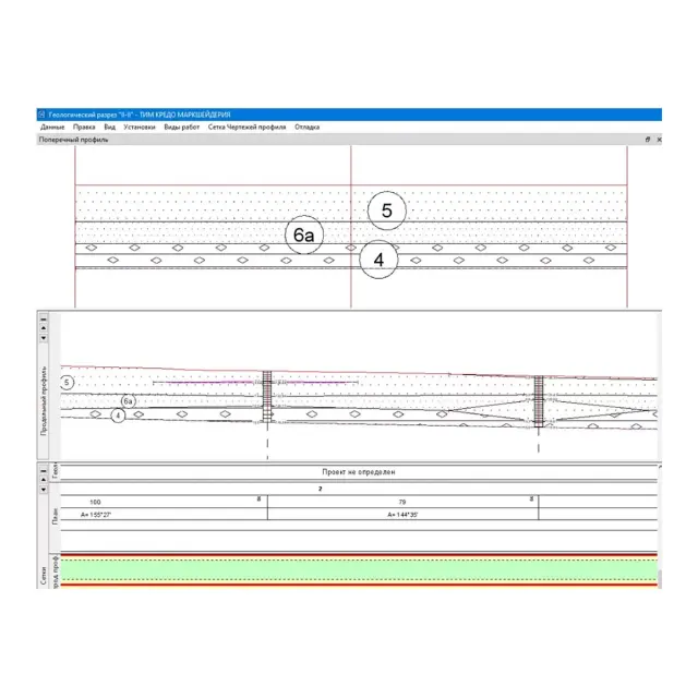 В простых ситуациях профили СЛ можно определить непосредственно при построениях в плане, задав необходимые отметки в узлах (по умолчанию они интерполируются из точек и поверхностей). При решении более сложных задач, например, моделирование вертикальных поверхностей (подпорных стенок и т.п.), можно перейти в окно профилей. Это позволит просматривать разрезы, пересечки и развернутый план СЛ и использовать широкие возможности создания и редактирования линий профилей.