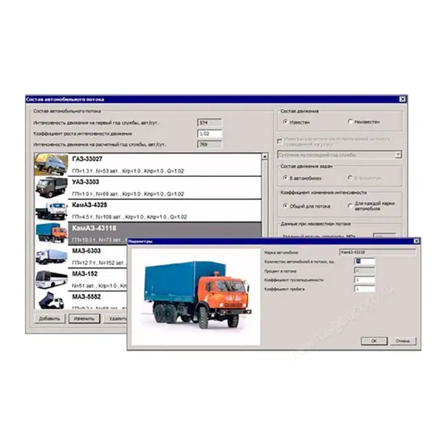 Базы автомобилей, материалов позволяют быстро заполнять либо редактировать исходные данные по автомобильному потоку, конструкции дорожной одежды.