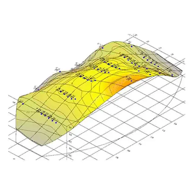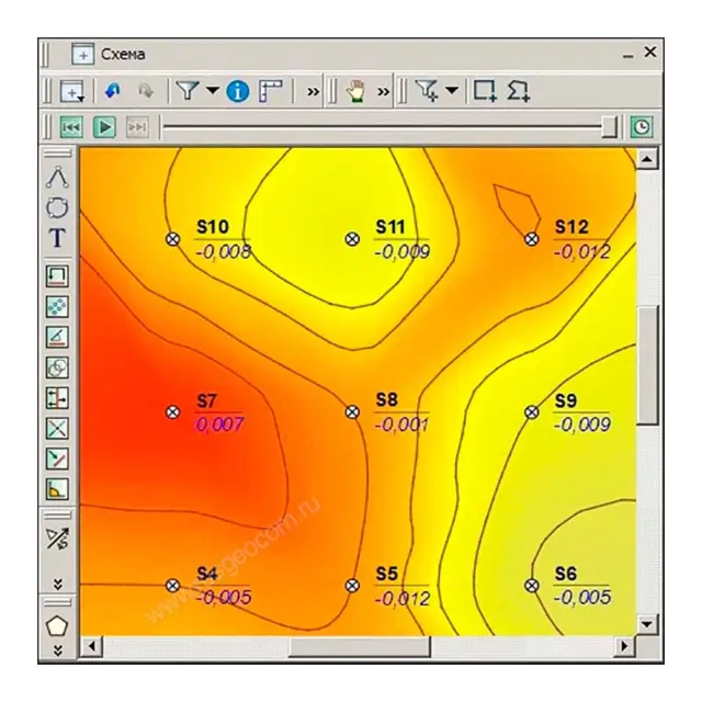 • Построение и отображение при помощи изолиний и градиентной заливки следующих видов деформационной поверхности: абсолютное смещение марок по высоте, скорости смещения марок по высоте, максимальной кривизны деформационной поверхности, изменение произвольных пользовательских данных, измеренных совместно с положениями марок, значения устойчивости контрольных пунктов в плане и по высоте.