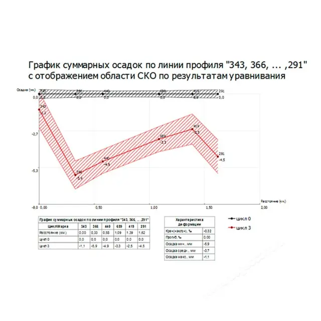 • текущая и суммарная абсолютная осадка марок с выделением цветом в таблице Пункты значений, превысивших установленные допуски;