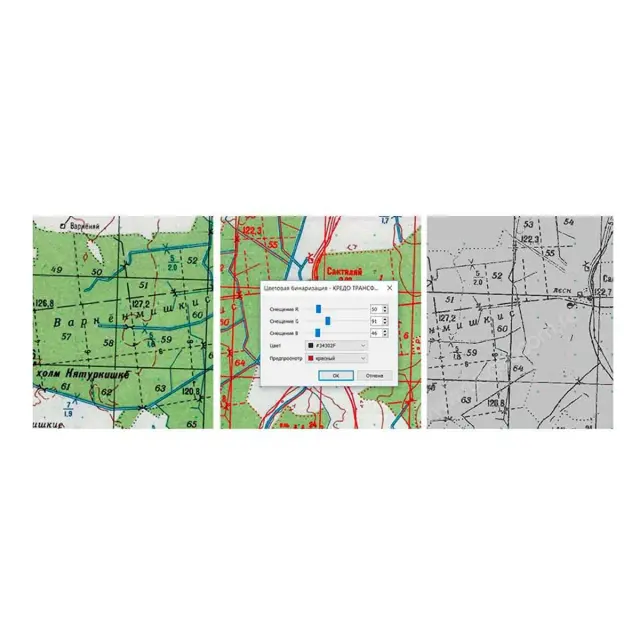 • привязка топографических карт в стандартной разграфке в СК-42 по четырем углам с указанием номенклатуры листов. Автоматическое распознавание и генерация опорных точек в местах расположения линий перекрестий координатной сетки на топографических картах в стандартной разграфке;
