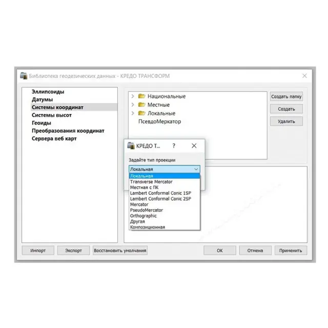 • поддержка локальной системы координат или систем координат в проекциях — Поперечно-цилиндрическая Меркатора, ПсевдоМеркатора, Коническая Ламберта, Ортографическая, Композиционная и ряда других;