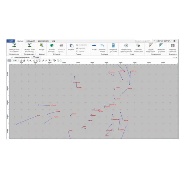 • Визуализация поверхностью различных данных по точкам проекта (эллипсоидальные и нормальные высоты, аномалии высоты, масштабный коэффициент) и по сеткам (сетки поправок NTv2, масштабный коэффициент).