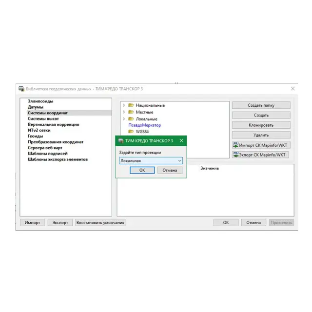 Программная система ТИМ КРЕДО ТРАНСКОР является подсистемой Программной системы ТИМ КРЕДО (Технологии Информационного Моделирования КРЕДО), которая обеспечивает доступ к следующей функциональности: преобразования геоцентрических, геодезических и прямоугольных плоских координат по известным параметрам связи, для установления (уточнения) параметров связи различных систем координат и ключей местных систем координат, расчета высотной коррекции (калибровке по высоте) и формирования пользовательских моделей геоида.