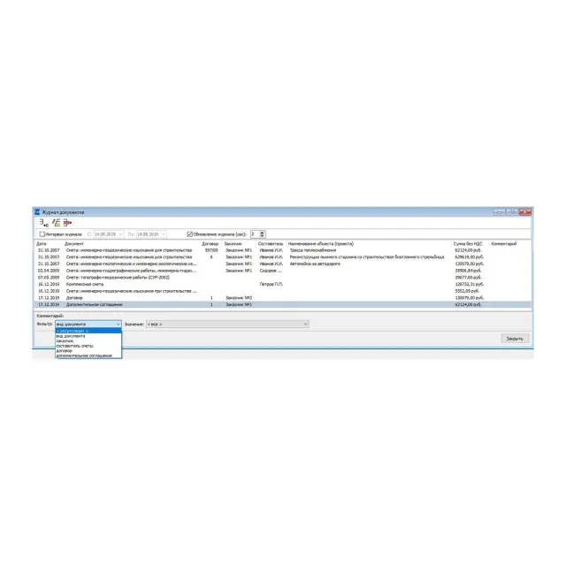 Весь список созданных пользователем документов представлен на экране в виде журнала документов (рис. 3). В нем отображается информация о каждом документе, а именно: дата его создания, тип, заказчик, а также порядковый номер договора, составитель сметы. Удобным инструментом ведения журнала является возможность сортировки его содержания по виду документа, дате его создания, заказчику, сметчику и т.п.