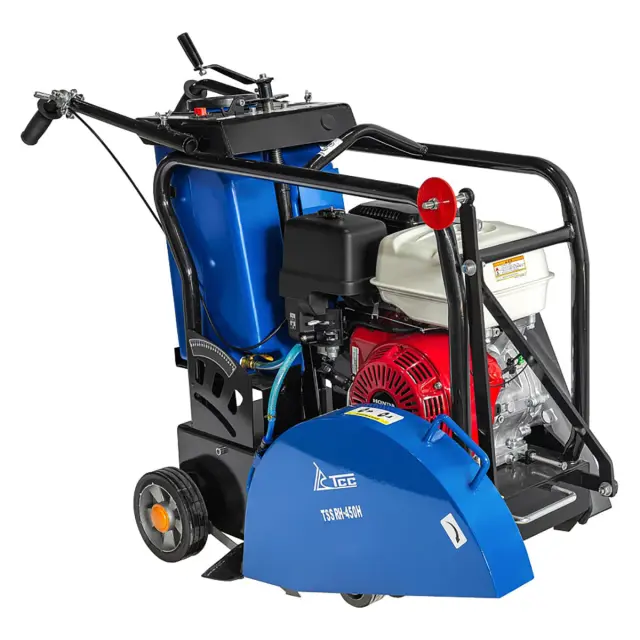 Двигатель резчика TSS RH-450H защищен прочной стальной рамой, которая не только обеспечивает надежную защиту, но и позволяет оператору легко перемещать инструмент по рабочей поверхности.