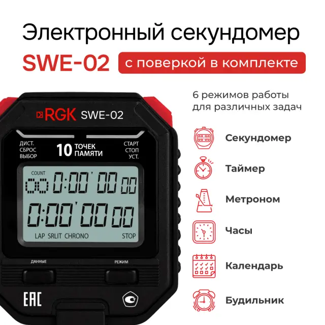 Технические характеристики Секундомер электронный RGK SWE-02 с поверкой