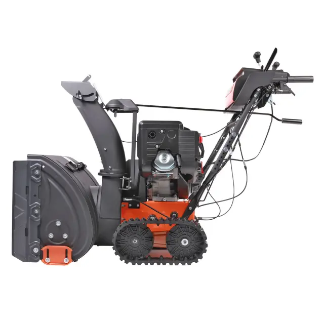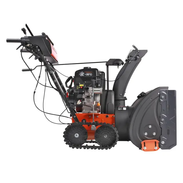 Мощность мотора бензинового снегоуборщика составляет 11 лошадиных сил, чего достаточно для борьбы с самыми тяжелыми снежными заносами. Кроме того, агрегат имеет регулируемый желоб для выброса снега, дающий возможность поворачивать его на 190 и наклонять в диапазоне 70 градусов соответственно.