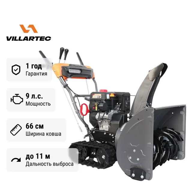 Снегоуборщик бензиновый самоходный Villartec WB 9061ET на гусеничным шасси готов справиться с любыми, даже самыми сложными условиями. Гусеницы - не маркетинговый ход, а гарантия превосходного сцепления на обледенелых участках, заснеженных склонах и рыхлом снегу. Они обеспечивают отличное тяговое усилие, позволяя снегоочистителю уверенно передвигаться даже по неровной поверхности. Повышенная устойчивость к опрокидыванию – еще один важный плюс, обеспечивающий безопасность работы.