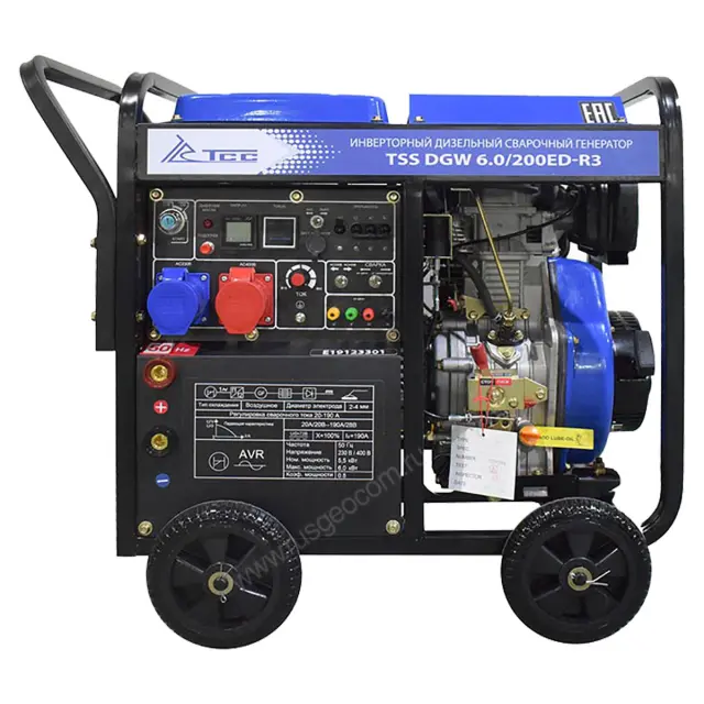 Сварочный генератор TSS DGW 6.0/200ED-R3 мощностью 6 кВт - это мобильная электростанция с дизельным двигателем и инверторным блоком, который служит для выполнения ручной дуговой сварки током номиналом до 190 А в долговременном режиме. В отличие от модификации "R", данная модель оснащается трехфазным альтернатором, благодаря чему может дополнительно использоваться для питания электроинструментов, систем и устройств переменного тока с рабочим напряжением как 230 В, так и 400 В.
