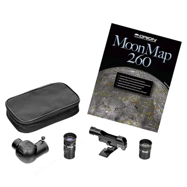 Также в комплект входит искатель с красной точкой, который упрощает наведение на интересующие вас объекты, и карта лунной поверхности moonmap 260, которая поможет найти кратеры, моря или материки, расположенные на луне.