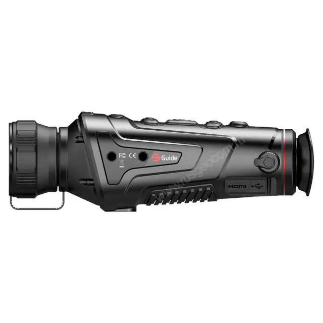 Важным преимуществом этой модели является объектив с фокусным расстоянием 50 мм. Благодаря этому, у тепловизионного монокуляра самая большая оптическая кратность 3,3x, а максимальная дальность действия достигает порядка 1400 метров. Это позволяет обнаружить цель размерами 1,8x0,5 на значительном расстоянии.