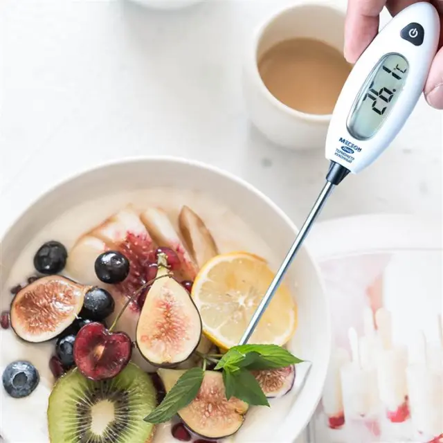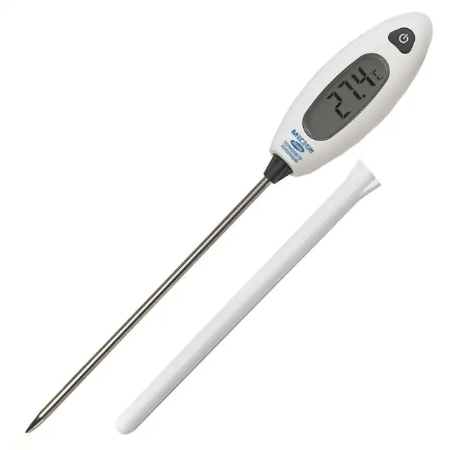 Термометр цифровой контактный МЕГЕОН 26400 предназначен для определения внутренней температуры продуктов питания: пищевого сырья, полуфабрикатов и готовых блюд в градусах Цельсия или Фаренгейта. Он выполнен в виде моноблочного изделия, с корпусом из белой гигиенической пластмассы, на котором жестко зафиксирован заостренный погружной зонд с оболочкой из химически нейтральной нержавеющей стали. Модель обладает широким измерительным диапазоном, от –50 до +300°С, при разрешении 0,1°С, благодаря чему подходит для контроля охлажденной и замороженной продукции, а также отслеживания соблюдения технологии приготовления блюд, регистрируя температуру при тепловой обработке.